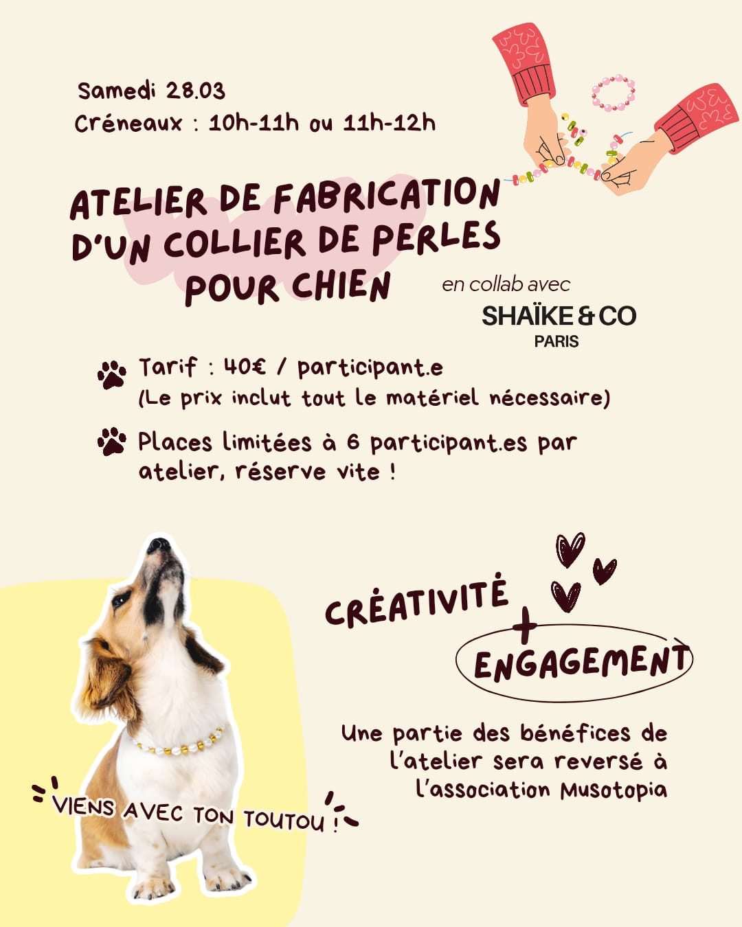 Le Canithé et Shaïke&Co s’associent autour d’un atelier de création d’un collier personnalisé en perles pour ton chien 🩷