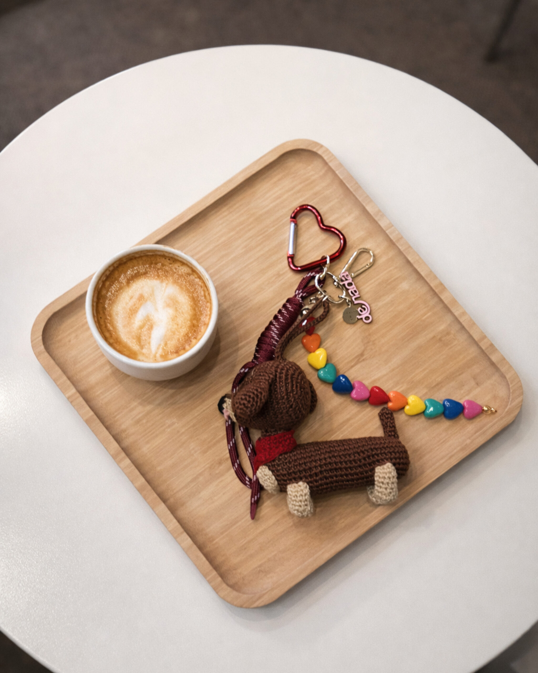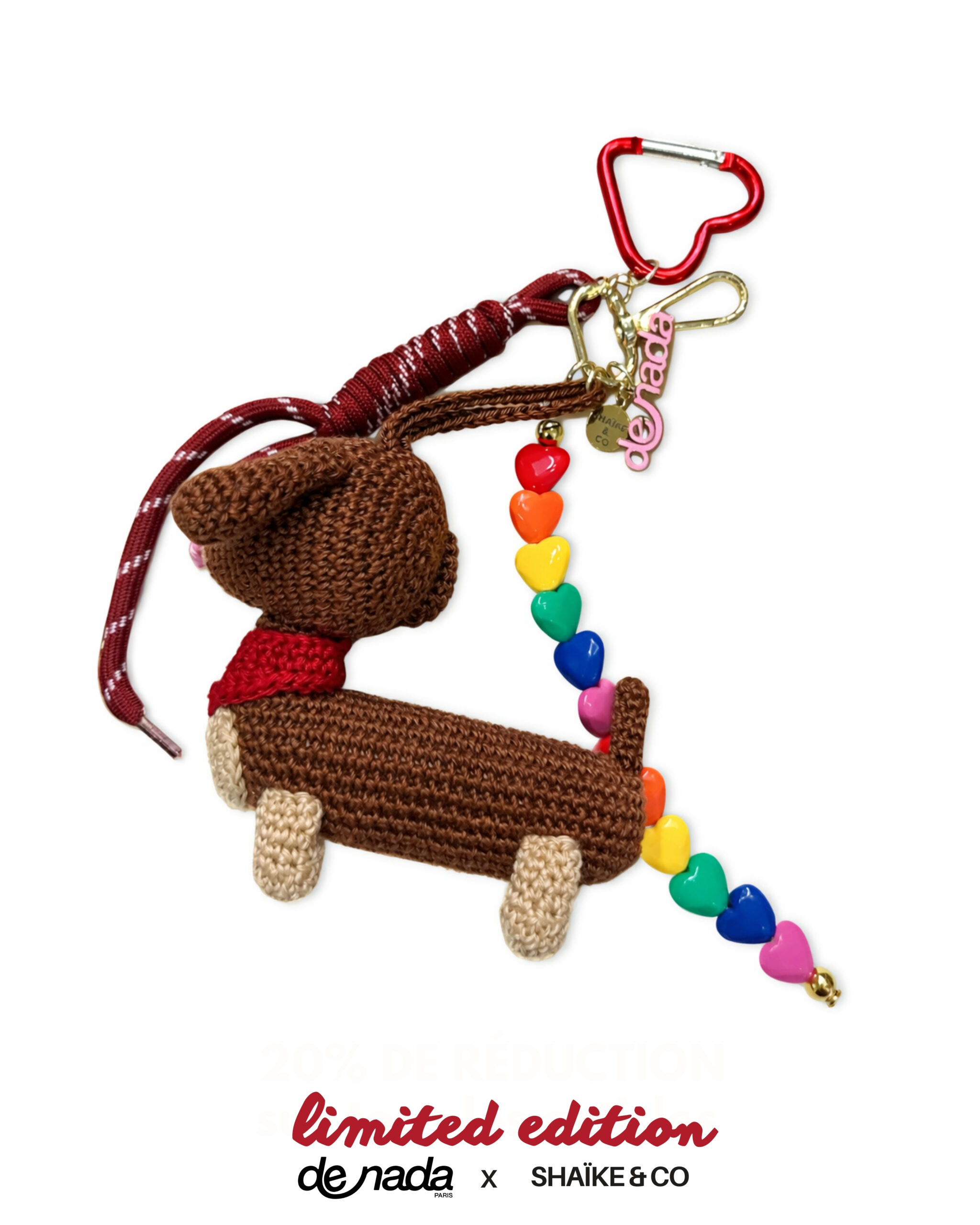 Il se compose d’un chien en crochet, d’un fil de perles cœurs multicolores, d’un cordon textile et de deux mousquetons, permettant de l’accrocher facilement à un sac ou à des clés.Le chien en crochet est la pièce centrale du grigri. Chaque modèle est assemblé à la main.